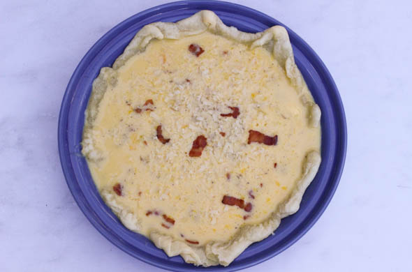 Pour the egg mixture in, and sprinkle the remaining cheese and bacon.