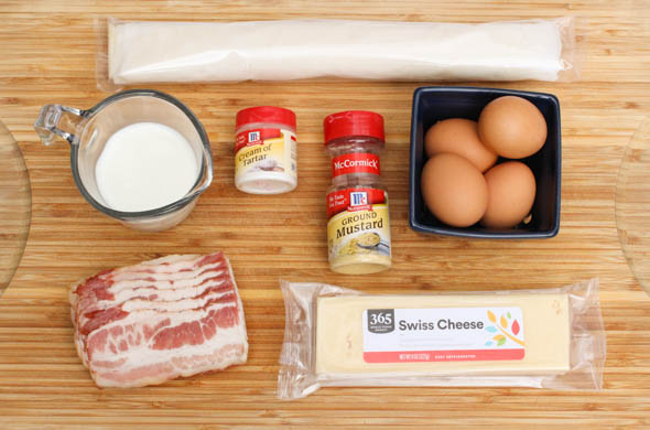 While the crust bakes, whisk together the eggs, cream, mustard, cream of tartar, and salt & pepper.
