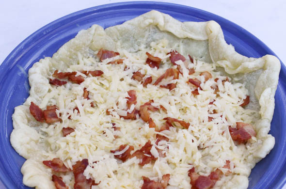 Add half the bacon and half the cheese into the crust.