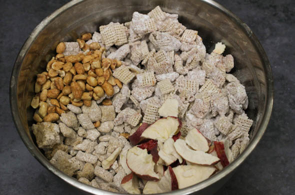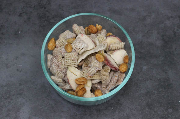 Pour over half of the chex and stir well. Pour into a zip-top bag and add half the powdered sugar and cinnamon. Shake to coat well.
