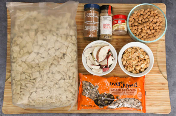 Pour over half of the chex and stir well. Pour into a zip-top bag and add half the powdered sugar and pie spice. Shake to coat well.