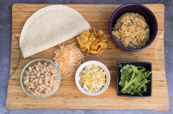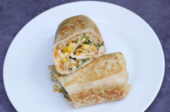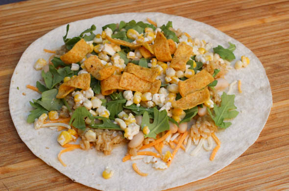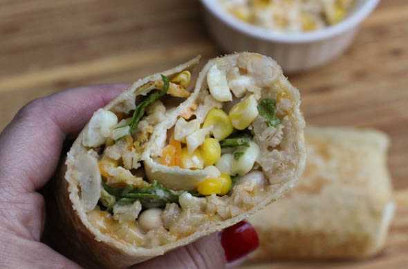 I love to ask the question: will it burrito-ize? This hot wrap/burrito is vegetarian, full of flavor, and has great texture. It is a full meal from the rice and beans and has bright and creamy street corn, crunchy chips, and fresh from greens.