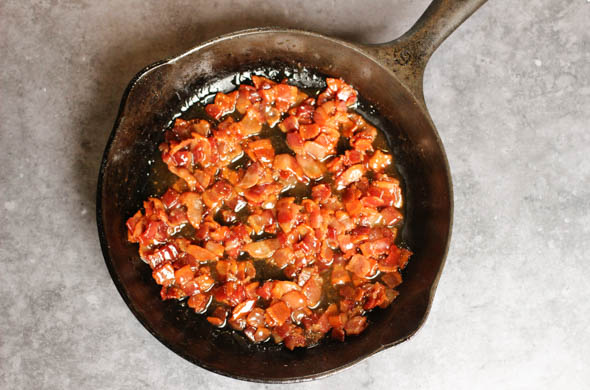 Chop and fry the bacon until crisp draining the grease but reserving a teaspoon or two.