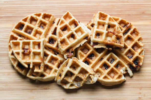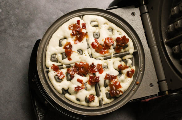 Mix the waffle batter adding in the reserved bacon drippings.