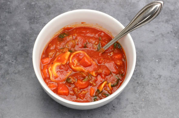 I loved the little bit of heat. The broth is perfect – it is tomato-y but the wine and chicken broth make it soup, not marinara sauce. This would be a good one to make in advance and just add the tortellini it when ready to serve it.